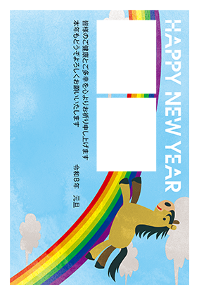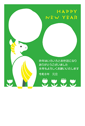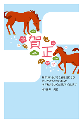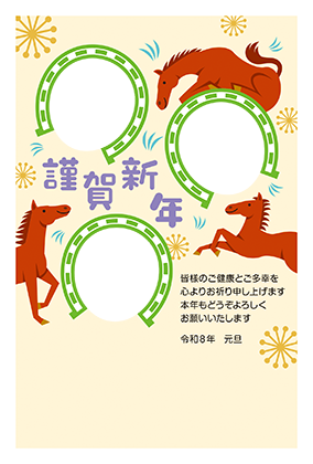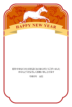 2026年、午年年賀状データ。IllustratorCS2形式データ、高解像度jpgデータ、挨拶文なしの高解像度jpgデータ、マニュアルをzip圧縮にて。IllustratorデータはAdobe IllustratorCS2以上が必要。jpgデータは宛名ソフトなどで使用可能。個人の年賀状印刷使用のみに限定。印刷等、業務用の使用は不可。