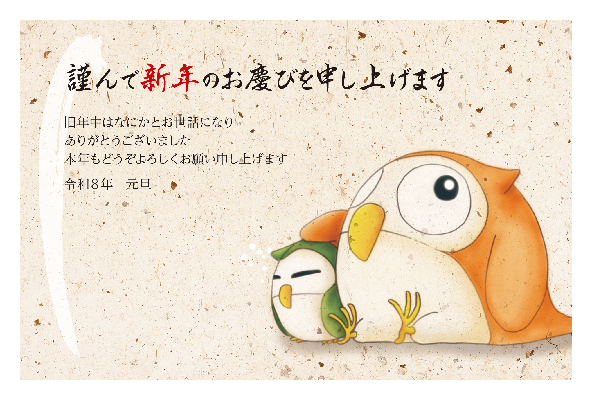 うたた寝をする子梟と、のんびり寄り添う親梟のイラスト年賀状。フクロウは、「福籠」「不苦労」等に通じ縁起がいいとされる動物です。これ、以前雑貨屋さんで働いてた時に知った縁起物知識だったりします。ふくろうといえば某魔法ファンタジーの白梟がいちばん有名なんでしょうか。私の描く梟はペンギンに間違われがちなんですけども……。