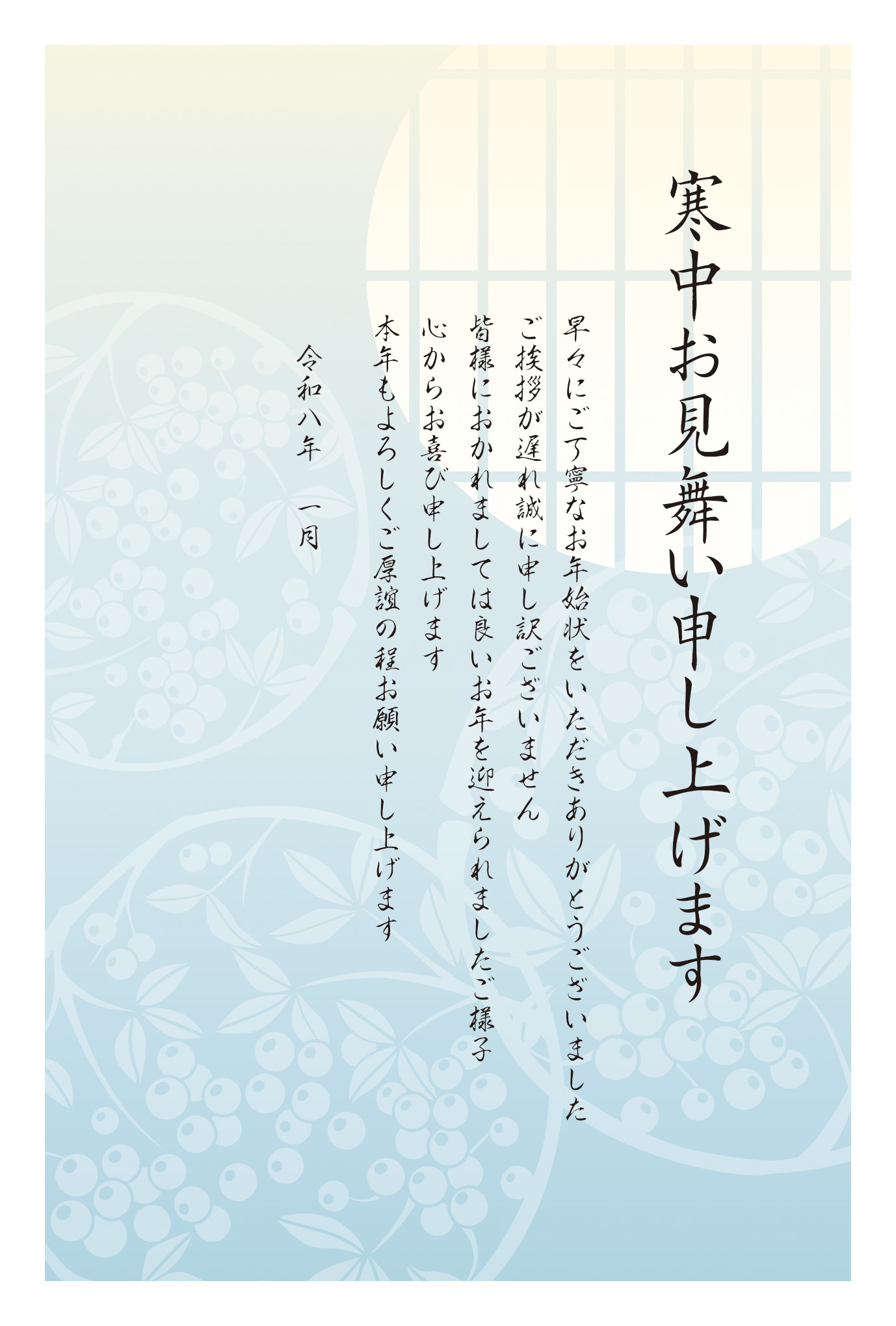 うっすらと南天の紋様を使用した寒中見舞いはがきです。年賀状を出していない人から年賀状をいただいてしまったけど、もう松の内過ぎちゃった、すんません、今年もよろしくです。という時に返信する挨拶文になってます。